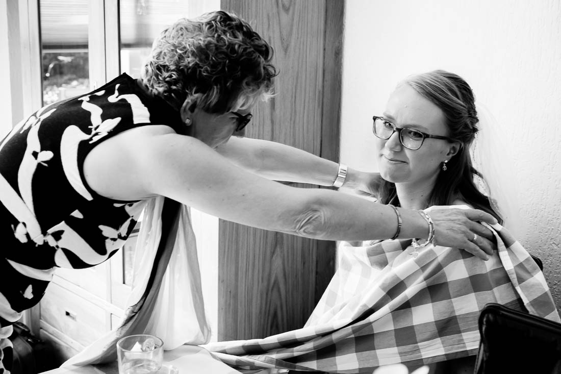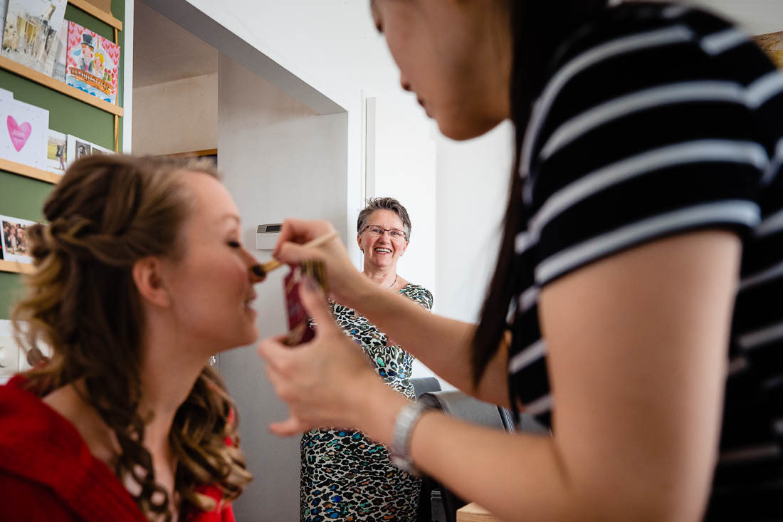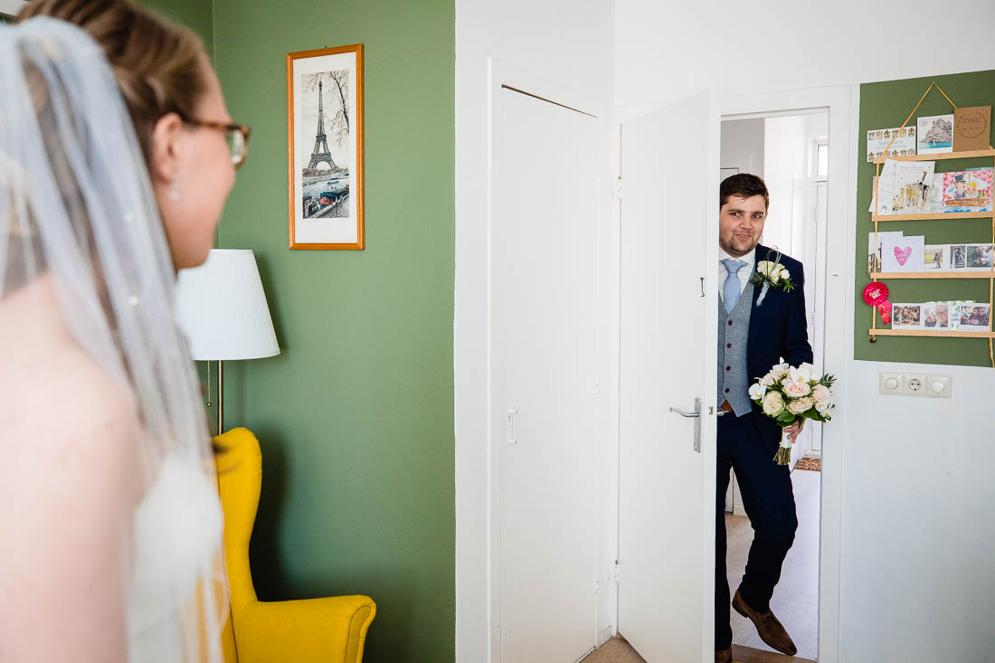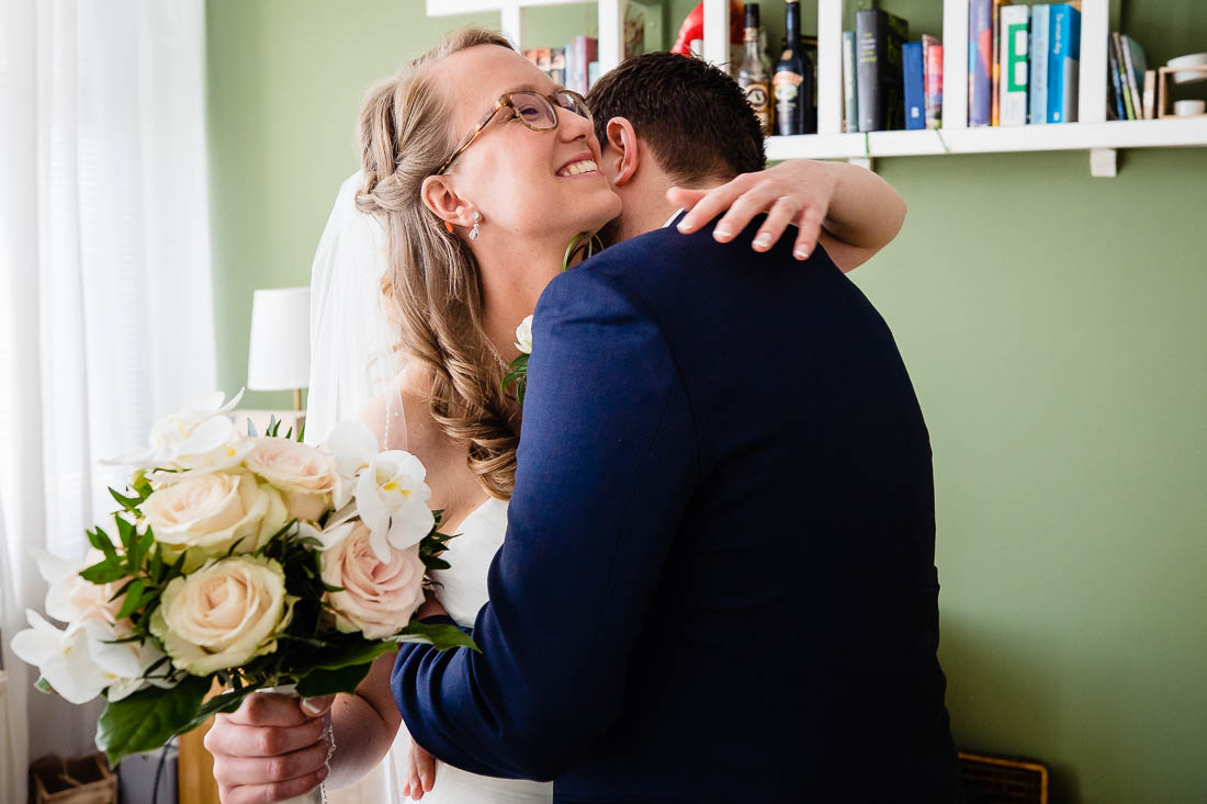 Je kan de first look bij de voordeur doen, in de achtertuin, het bos of een park, maar Ingrid en Arnaud kozen er voor om de first look bij hun thuis in de woonkamer te doen. Zonder iemand anders erbij om samen te genieten van het moment dat je elkaar voor het eerst ziet. Wat vind ik het toch mooi dat iedere bruiloft weer anders is en met verschillende momenten en emoties, prachtig!