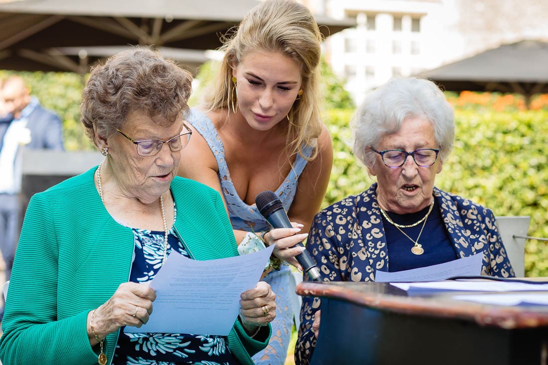 Charissa en Koen hadden voor de ceremonie van hun bruiloft iets bijzonders verzonnen. Zij vroegen aan hun twee lieve oma’s, die nog heel goed “bij de pinken” waren, om de hele speciale rol van ceremoniemeester op zich te nemen. Het zorgde voor volop hilariteit en gelach, want door wat versprekingen verliep het niet helemaal zoals gepland.