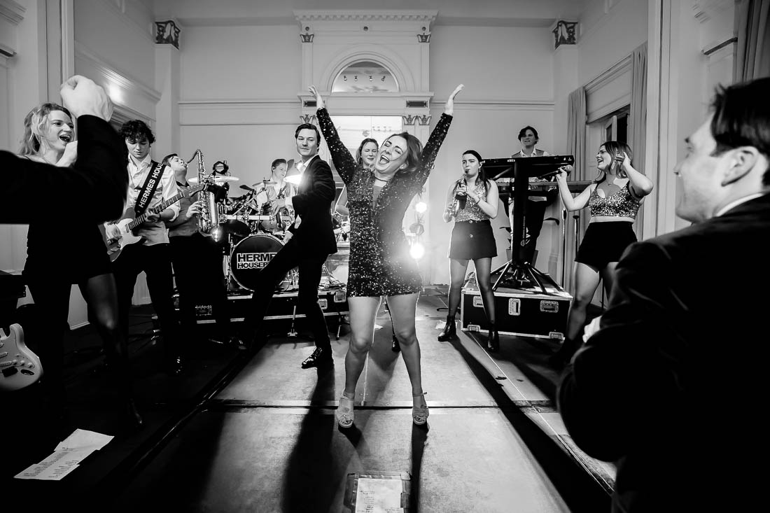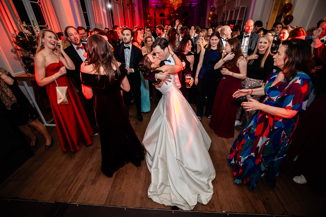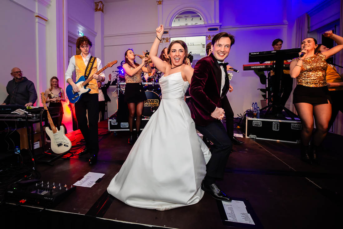 Want het motto van het bruidspaar was duidelijk: het is pas een feest als de Hermes House Band is geweest. En dat was te merken. Binnen no-time stond de dansvloer vol en werd er uitbundig gefeest. En alsof dat nog niet genoeg was, verscheen de bruid later op de avond in een spectaculaire tweede feestjurk. De perfecte afsluiter van een bruisende Rotterdamse bruiloft.