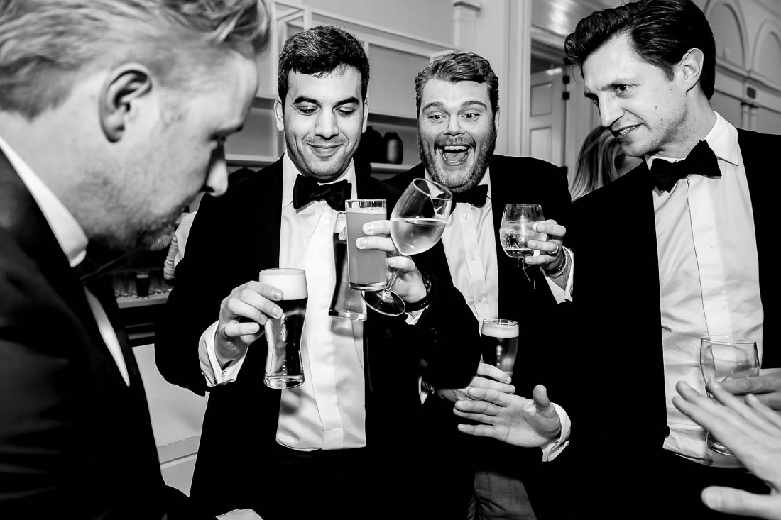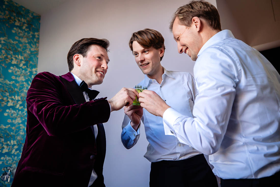 De ochtend begon in alle rust in de stijlvolle suites van Hotel Pincoffs, een geliefde trouwlocatie voor stellen die trouwen in Rotterdam. Hier maakten A & M zich klaar voor hun grote dag. De zon piepte even door de wolken, de sfeer was ontspannen, en de mannen trakteerden zichzelf op iets lekkers. De perfecte start van een onvergetelijke dag.