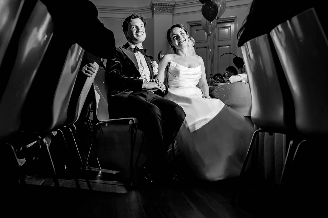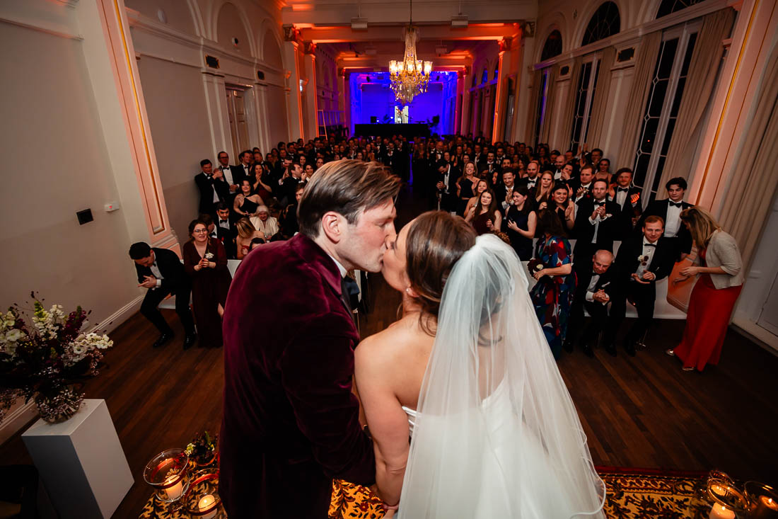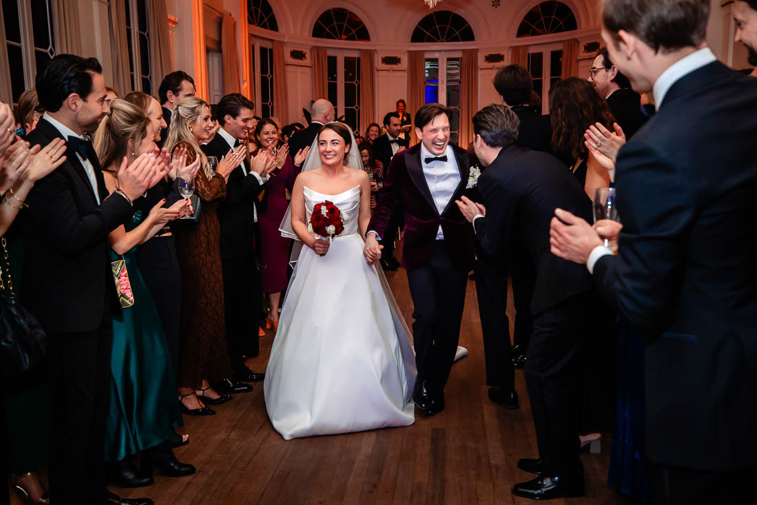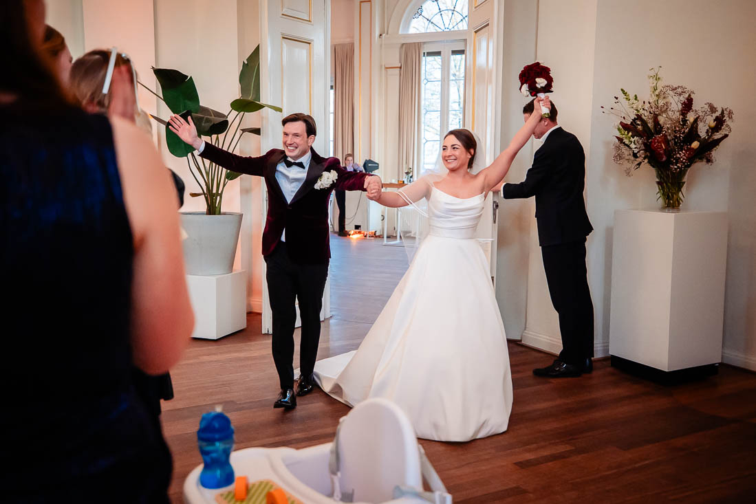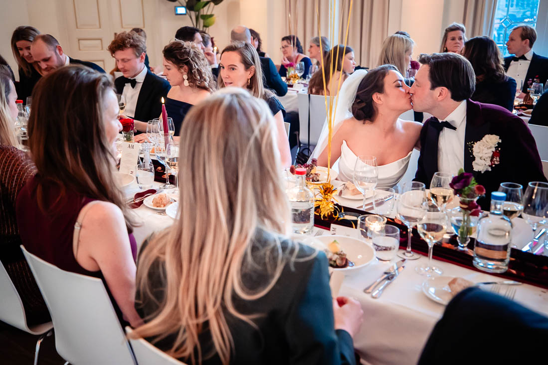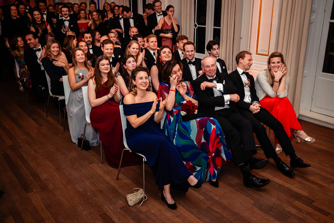 Na de first look stapte het bruidspaar in de auto richting het indrukwekkende Wereldmuseum Rotterdam. Vrienden en familie wachtten hen op in de sfeervolle dinerzaal. Maar A & M hadden nog een verrassing in petto: een spectaculaire binnenkomst – een ‘second look’ met hun gasten. De energie was voelbaar: applaus, gelach en blije gezichten overal.