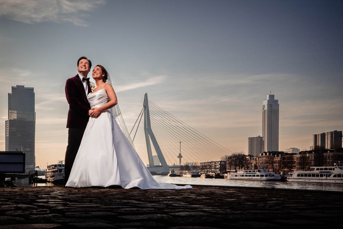 Een bruisende stad, een verliefd stel en een feest dat niemand snel zal vergeten — de bruiloft van A & M in Rotterdam had het allemaal. Van de romantische first look bij de Erasmusbrug tot een uitbundig feest met live muziek, deze dag was een perfecte mix van liefde, emotie en feestvreugde.