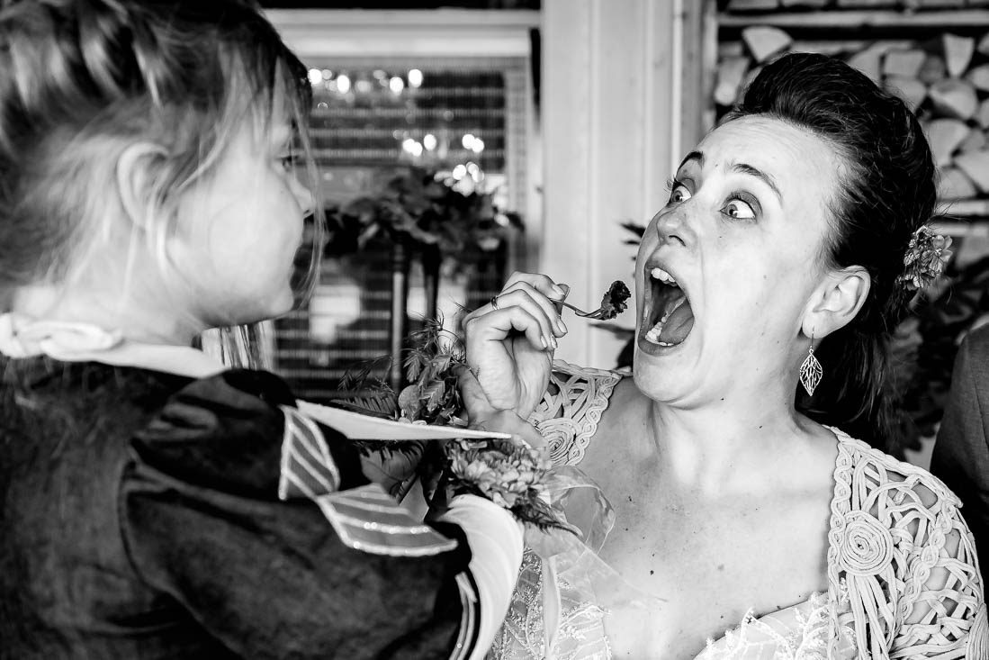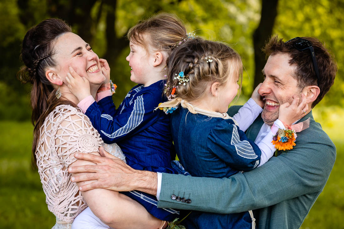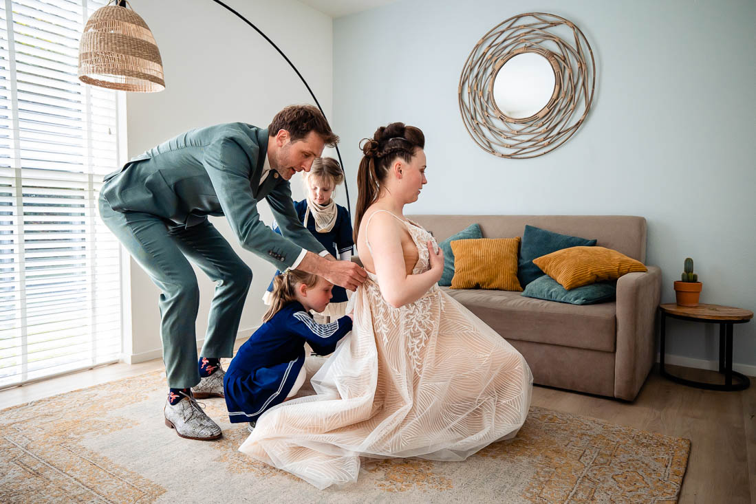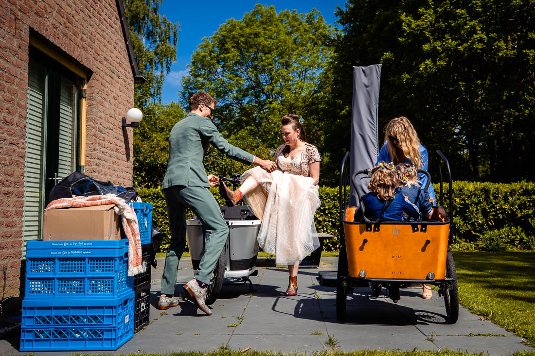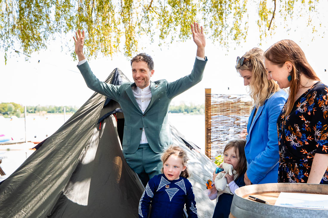 Ook ’s ochtends bij de getting ready ’s was meteen duidelijk waar ik moest zijn. Buiten stonden twee fietsen klaar helemaal bepakt met kampeerspullen om de dag na de bruiloft op fietsvakantie te gaan. De ceremonie zelf was een ontroerende gebeurtenis. Alles was versierd met prachtige bloemen, de zon scheen door de bomen en de vogels waren vrolijk aan het fluiten. Om het geheel compleet te maken stond zelf een kampeertent. Maar was was de bruidegom nu? Gelukkig vonden de kinderen hem na een korte zoektocht in de tent. Wat een originele entree was dat.