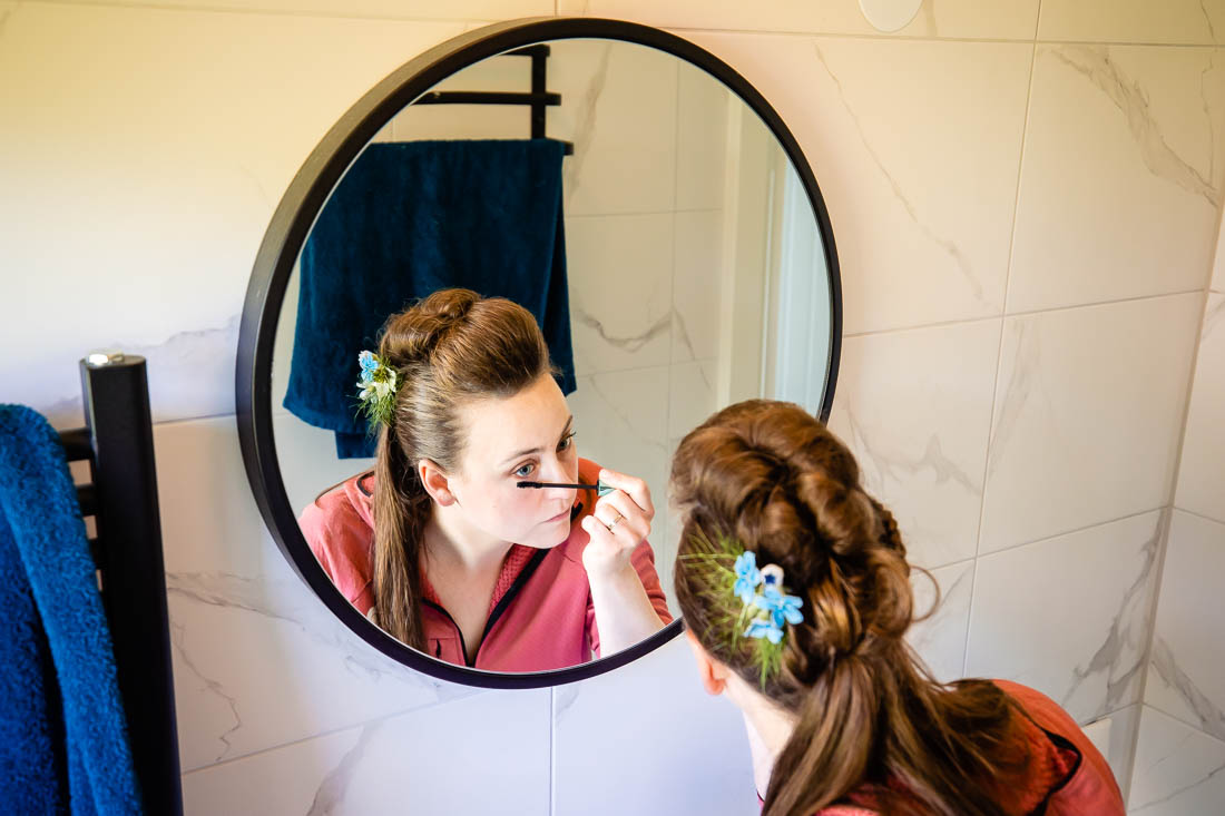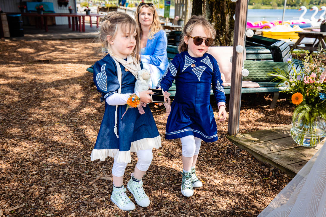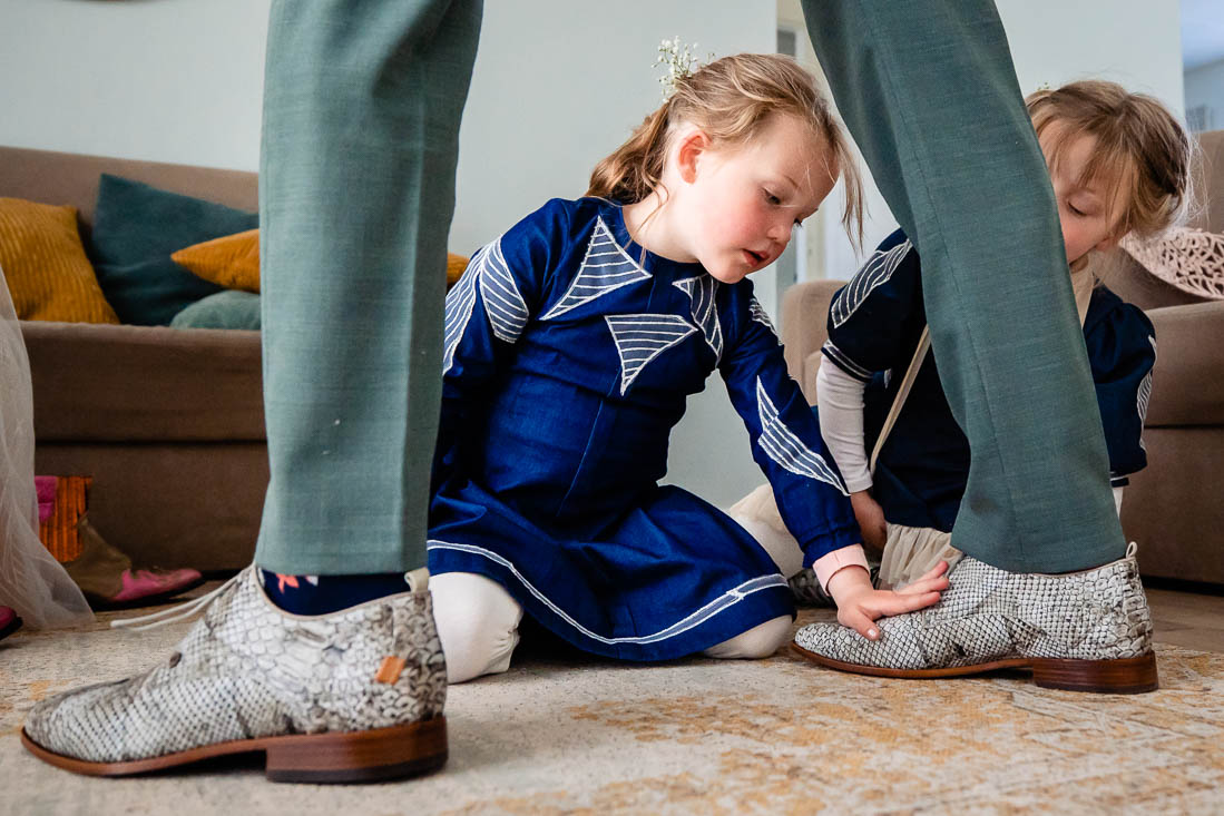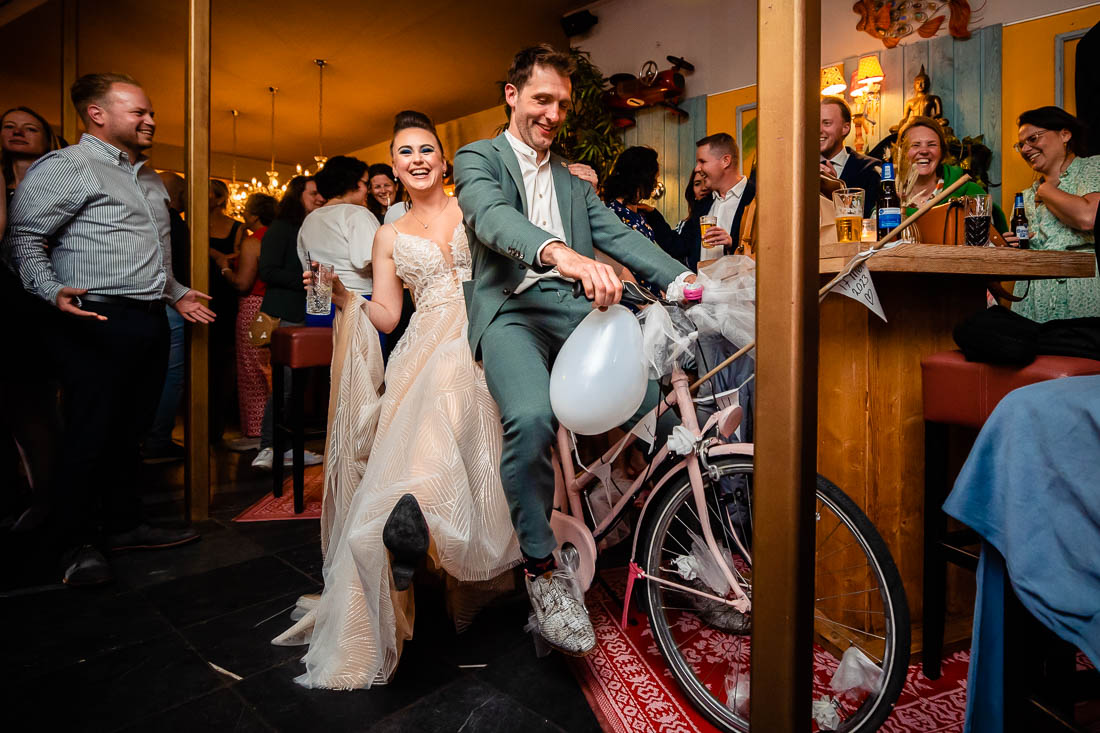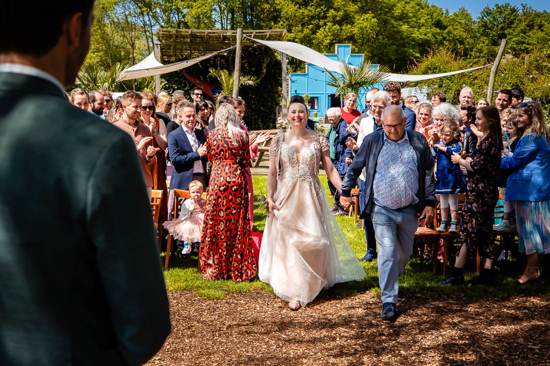 Ook ’s ochtends bij de getting ready ’s was meteen duidelijk waar ik moest zijn. Buiten stonden twee fietsen klaar helemaal bepakt met kampeerspullen om de dag na de bruiloft op fietsvakantie te gaan. De ceremonie zelf was een ontroerende gebeurtenis. Alles was versierd met prachtige bloemen, de zon scheen door de bomen en de vogels waren vrolijk aan het fluiten. Om het geheel compleet te maken stond zelf een kampeertent. Maar was was de bruidegom nu? Gelukkig vonden de kinderen hem na een korte zoektocht in de tent. Wat een originele entree was dat.