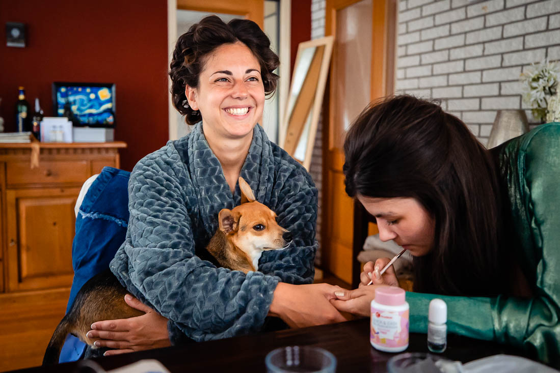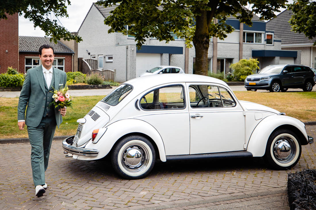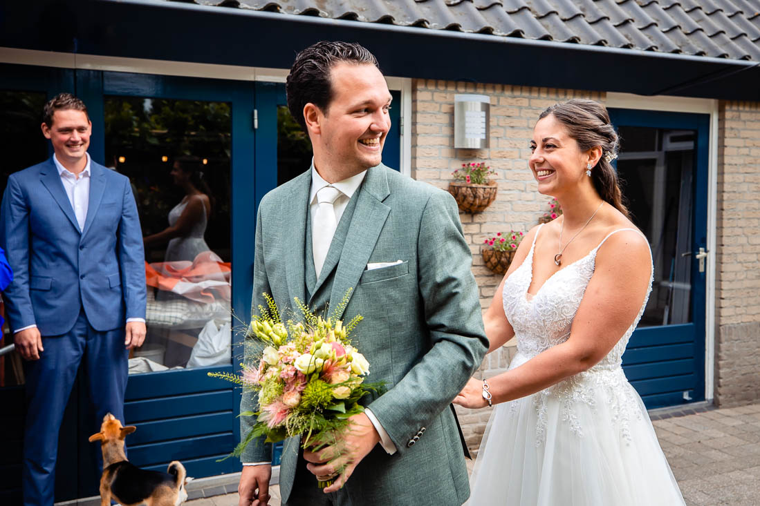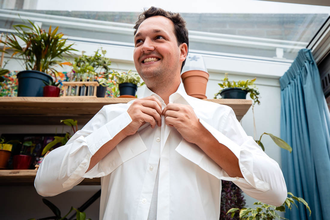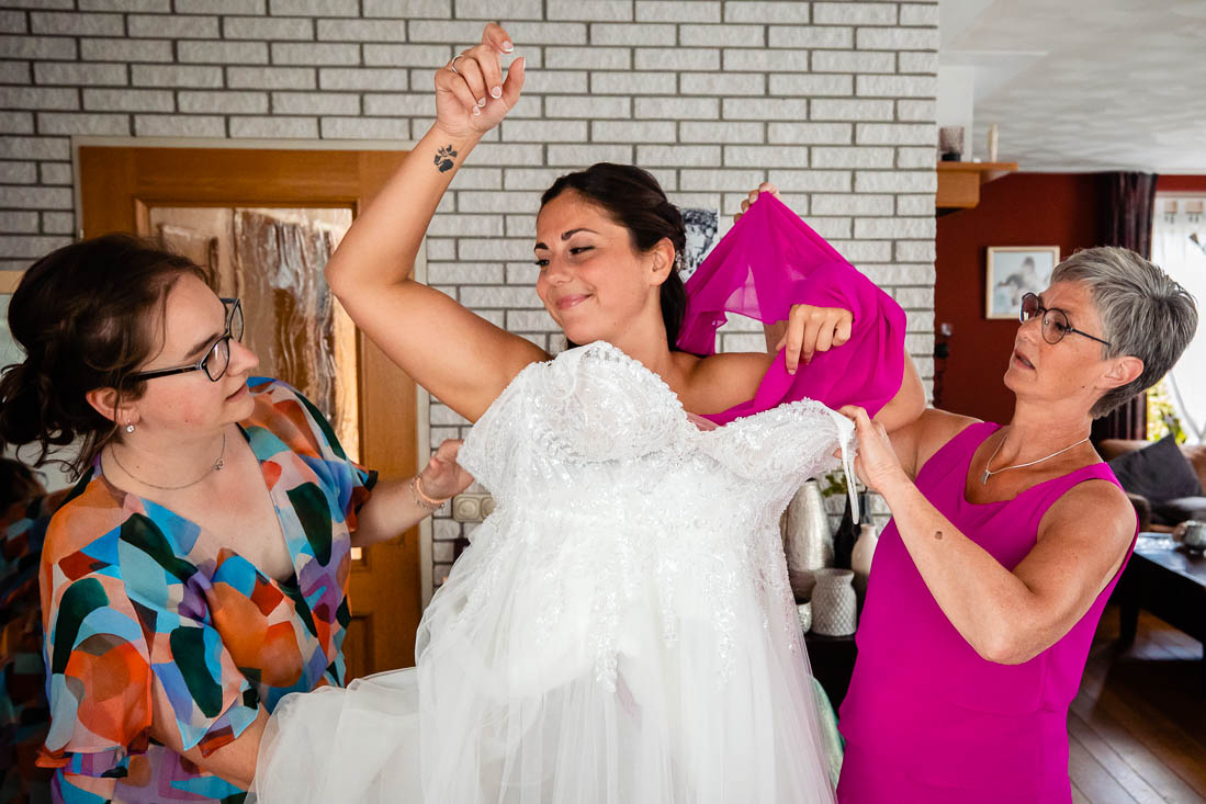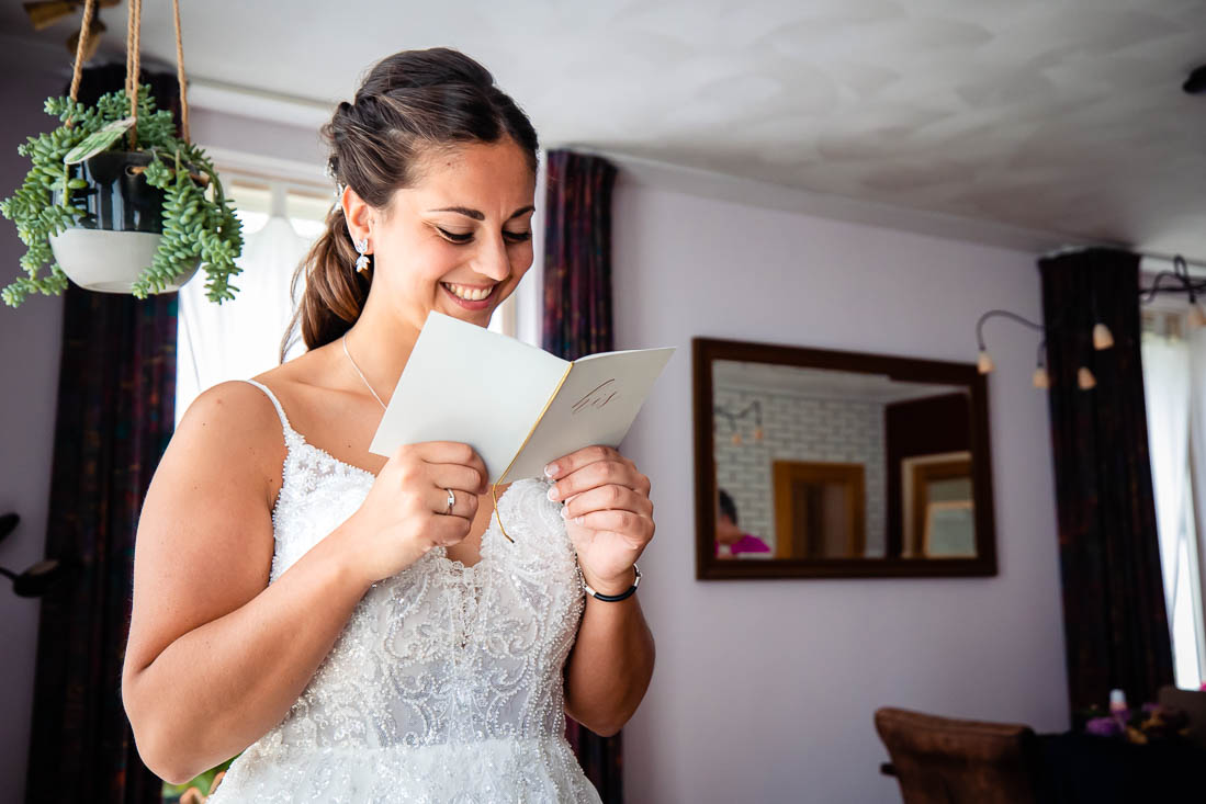 Het begon allemaal ’s ochtends waarbij de woonkamer van huis was omgebouwd tot “getting ready” kamer. Iedereen was druk met haar en make-up, terwijl de spanning in de lucht hing. Amy had inmiddels haar trouwjurk aangedaan en zag er adembenemend uit. Maar één persoon had haar nog niet gezien; haar vader. Hij stond in de keuken te wachten, vol spanning en opwinding om zijn dochter voor het eerst te zien op haar grote dag. Hij kan zich waarschijnlijk nog herinneren dat hij haar voor het eerst in zijn armen hield en nu stond hij klaar om haar als volwassen vrouw te zien, op het punt om in het huwelijksbootje te stappen.