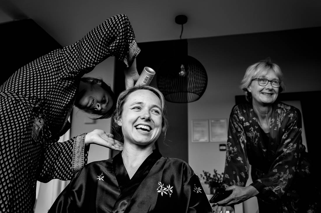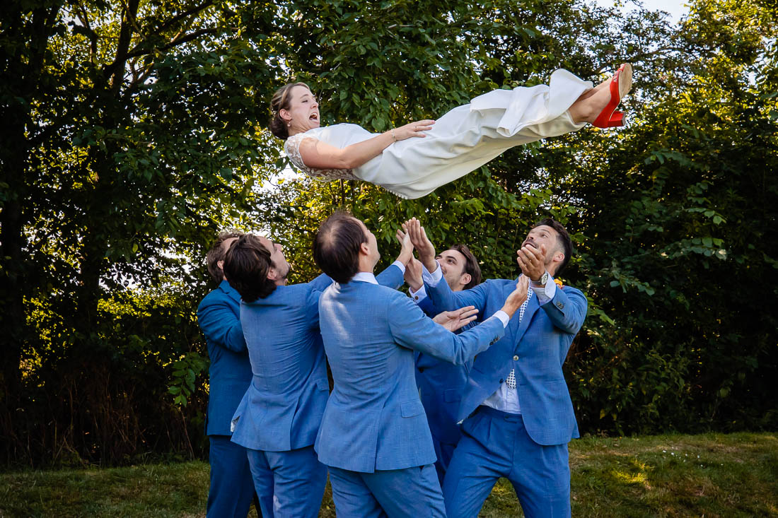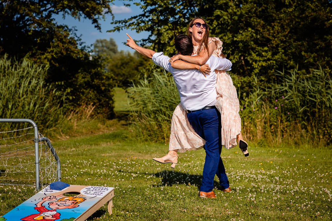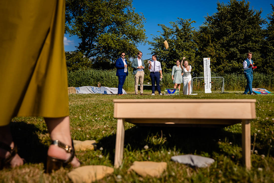 Terwijl ik bij de bruid was om haar zeer gezellige getting ready te fotograferen was mijn second shooter bij de mannen. Deze waren bezig met het opbouwen en spelen van allerlei spelletjes. Nu dacht ik dat ik als spelletjesfreak al heel wat spelletjes kende, maar van cornhole had ik nog nooit gehoord. Wat? Precies dat had ik ook. Het is een spel waarbij je een maiszakje in een gat probeert te gooien. Degene die de meeste punten gooit is de winnaar. En ja dat werd uitbundig gevierd.