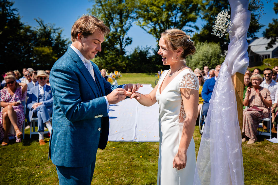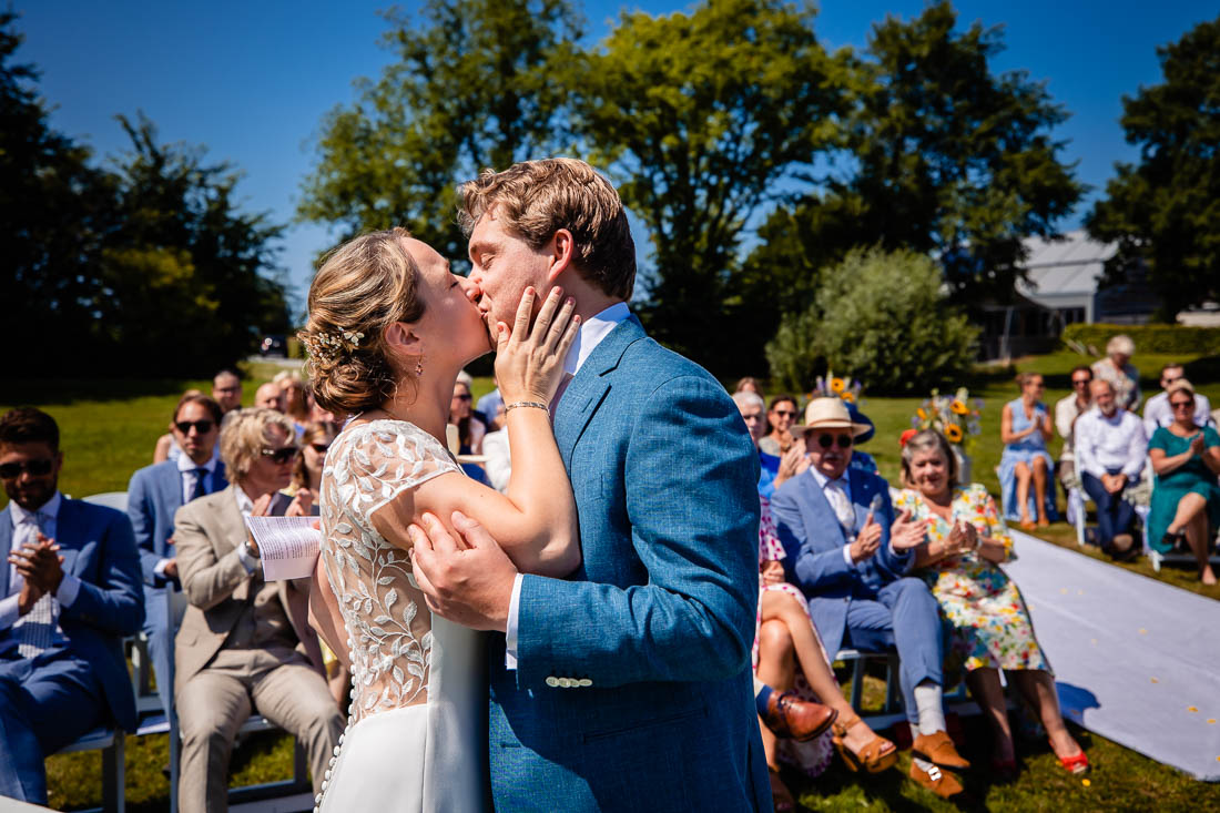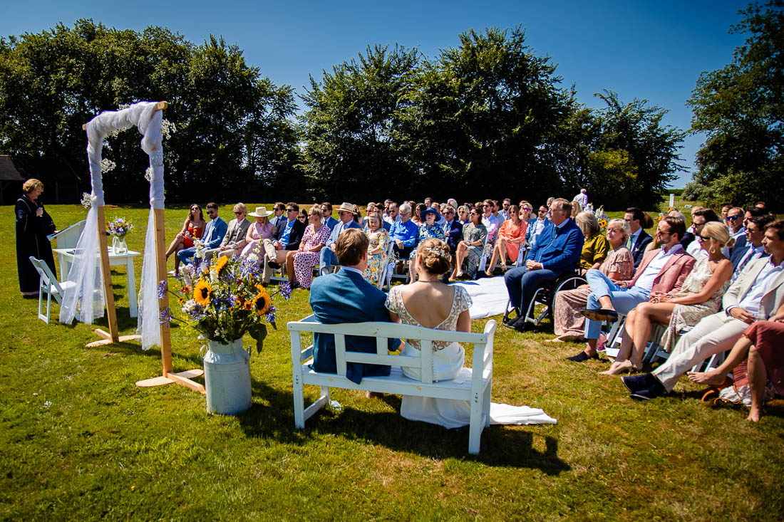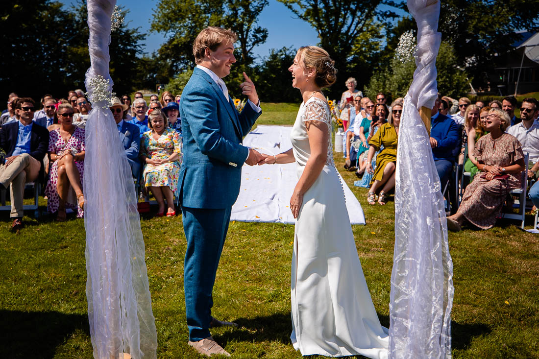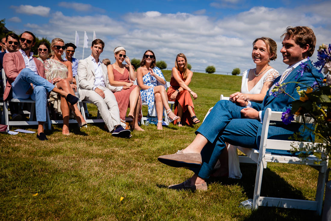 Maar toen was het zover, de ceremonie stond op het punt te beginnen. De bruid nam nog even voor de laatste keer haar tekst door en toen was het grote moment daar. Super tof, want de ceremonie was ook het moment dat de bruid en bruidegom elkaar voor het eerst zouden zien. Het was prachtig om al die liefde te zien. Het werd nog een hele relaxte zomerdag waarbij we nog mooie momenten hebben mogen fotograferen. Zelfs het kind in het bruidspaar kwam even helemaal los. Iets wat maar net goed ging overigens, maar dat zal je bij het bekijken van de foto’s zien 😉
