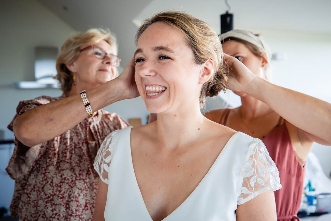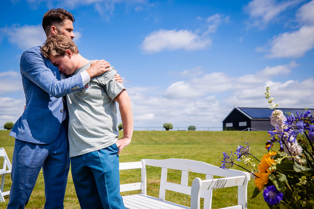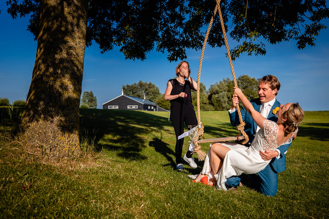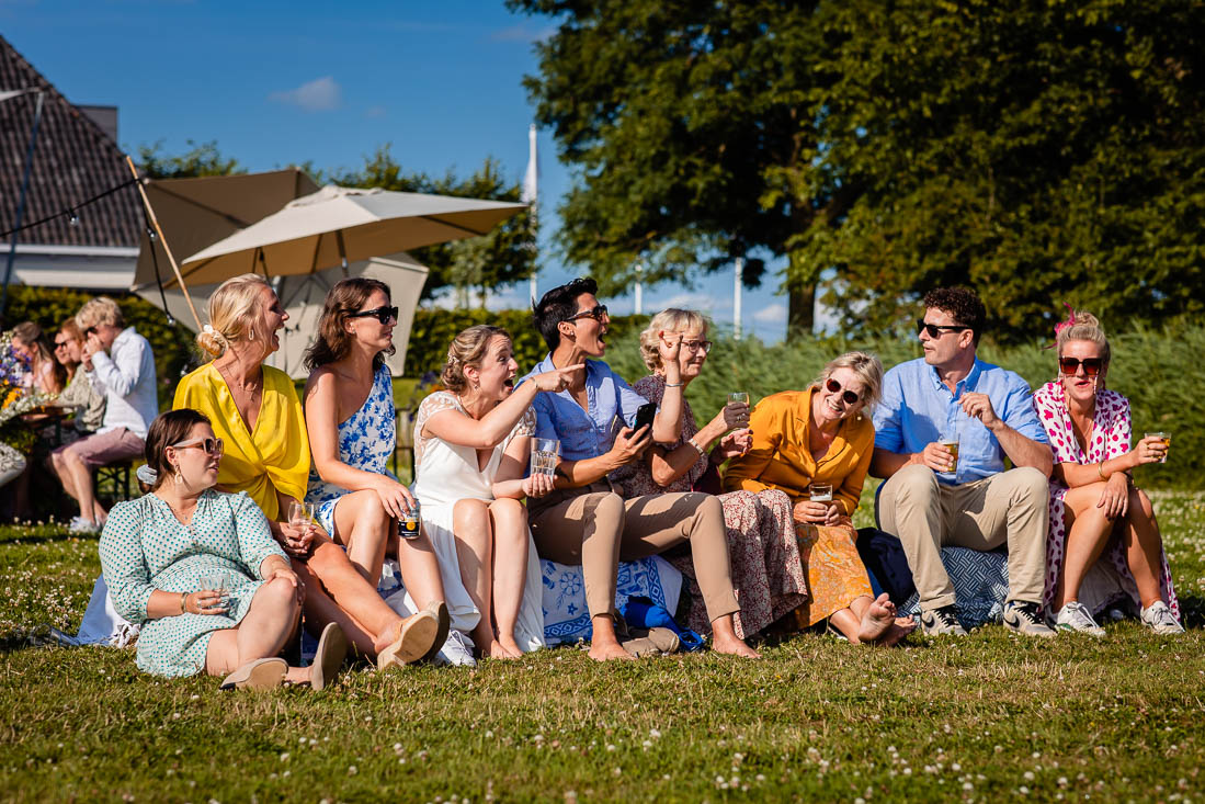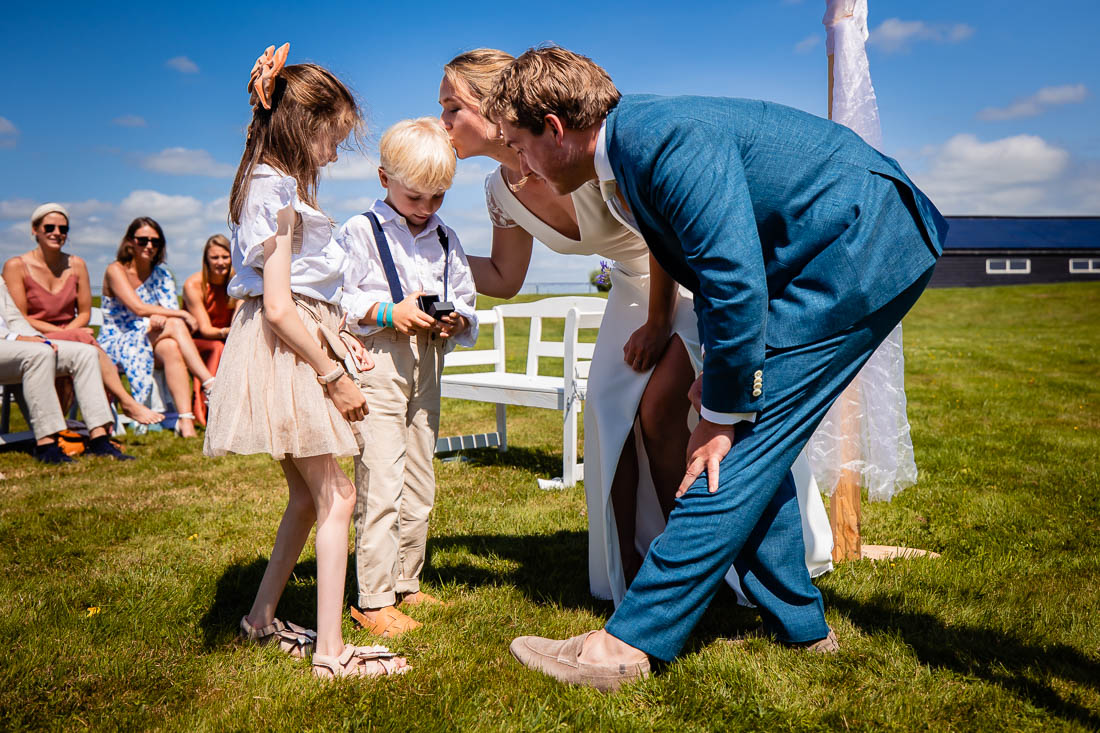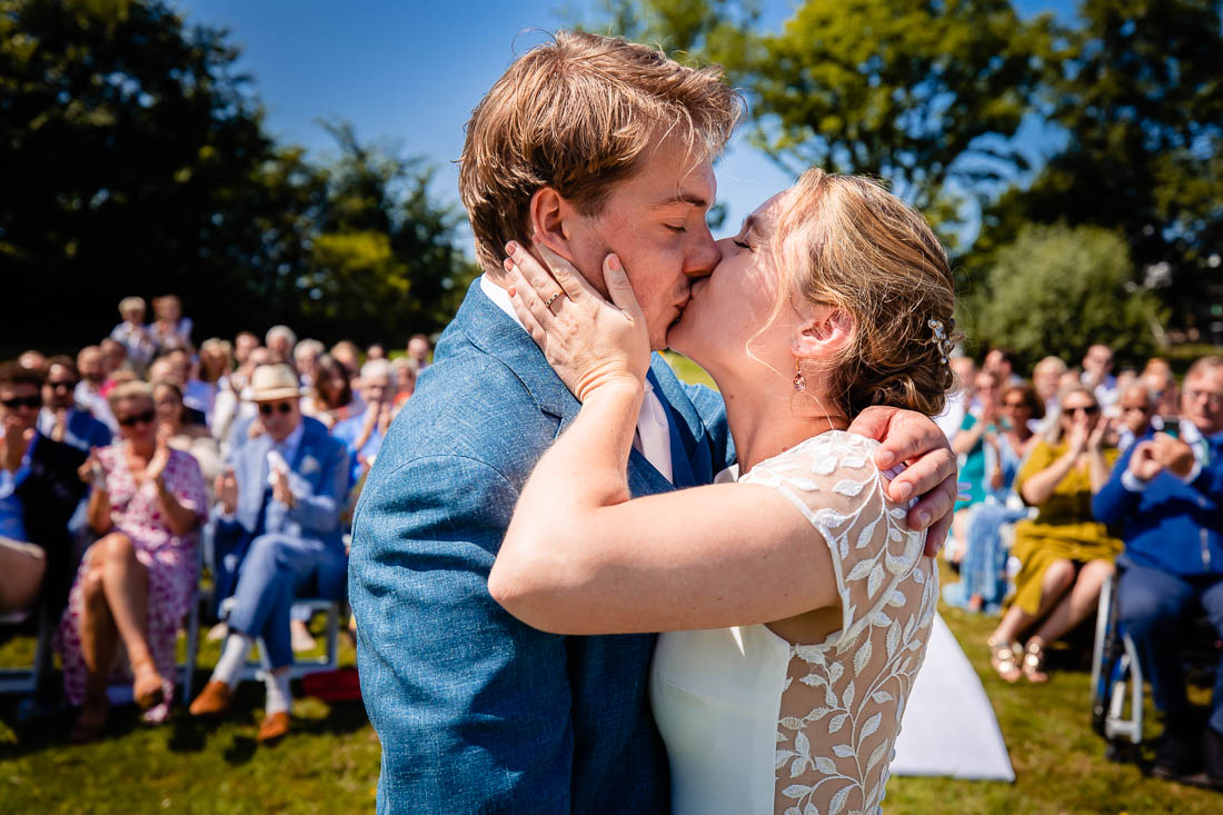 Maar toen was het zover, de ceremonie stond op het punt te beginnen. De bruid nam nog even voor de laatste keer haar tekst door en toen was het grote moment daar. Super tof, want de ceremonie was ook het moment dat de bruid en bruidegom elkaar voor het eerst zouden zien. Het was prachtig om al die liefde te zien. Het werd nog een hele relaxte zomerdag waarbij we nog mooie momenten hebben mogen fotograferen. Zelfs het kind in het bruidspaar kwam even helemaal los. Iets wat maar net goed ging overigens, maar dat zal je bij het bekijken van de foto’s zien 😉