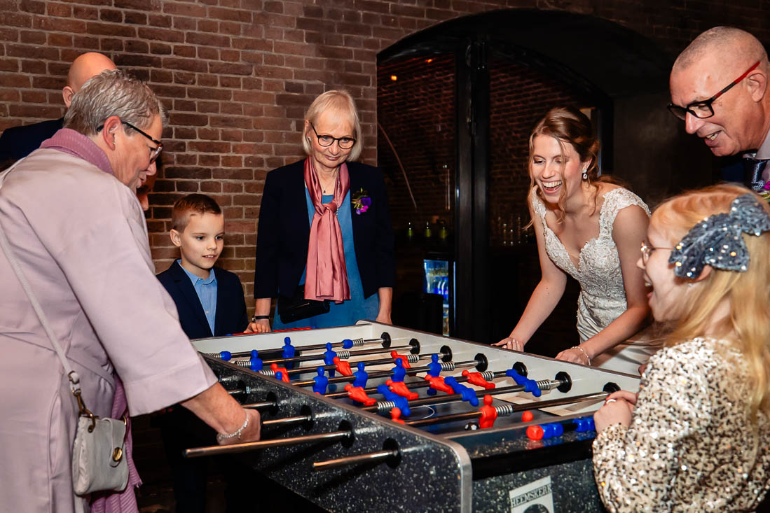 Tijdens de borrel ging het er fanatiek aan toe bij het tafelvoetbal en in de avond ging letterlijk het dak eraf tijdens het feest. Dansen, lachen en losgaan: als trouwfotograaf leg ik deze momenten onopvallend vast, zodat jullie herinneringen levend blijven.