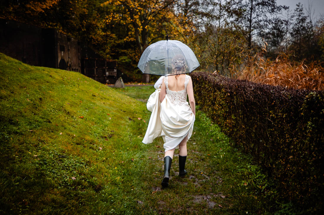 Fotoshoot in de regen bij Fort Vechten, unieke en creatieve trouwfoto’s