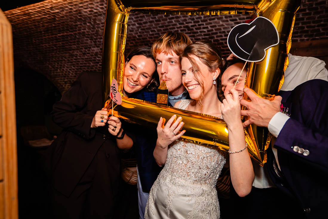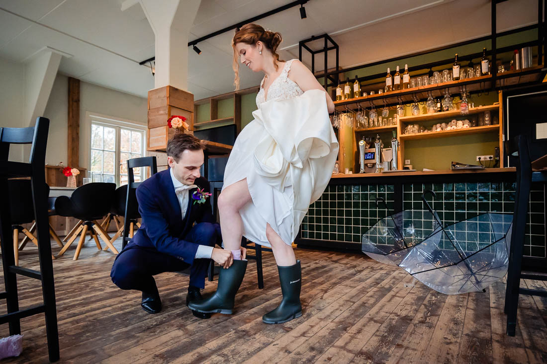 Het weer was regenachtig, maar juist dat maakte deze bruiloft extra speciaal. Zo trok het bruidspaar de laarzen aan tijdens de fotoshoot bij Fort Vechten. Met paraplu’s, regen en toffe plekken ontstonden er unieke en creatieve beelden. Als ervaren trouwfotograaf weet ik hoe je met regen toch ook prachtige trouwfoto’s maakt.